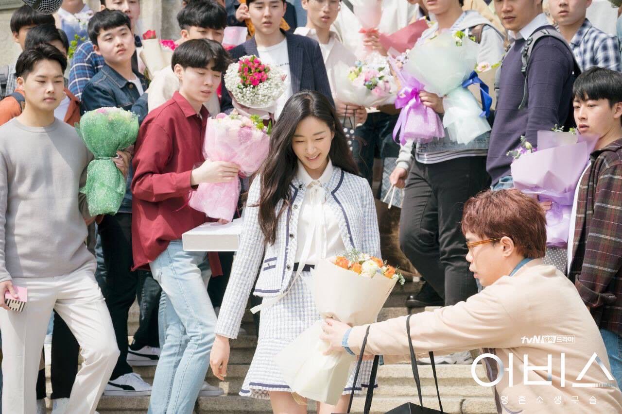 Trong ảnh được chia sẻ, Kim Sarang đi ngang qua một đám sinh viên đang chờ để tặng hoa cho cô. Và người bạn thân Cha Min, cũng chờ kèm theo một bó hoa. Tuy nhiên, cô ấy không dừng lại mà lướt qua nhanh.