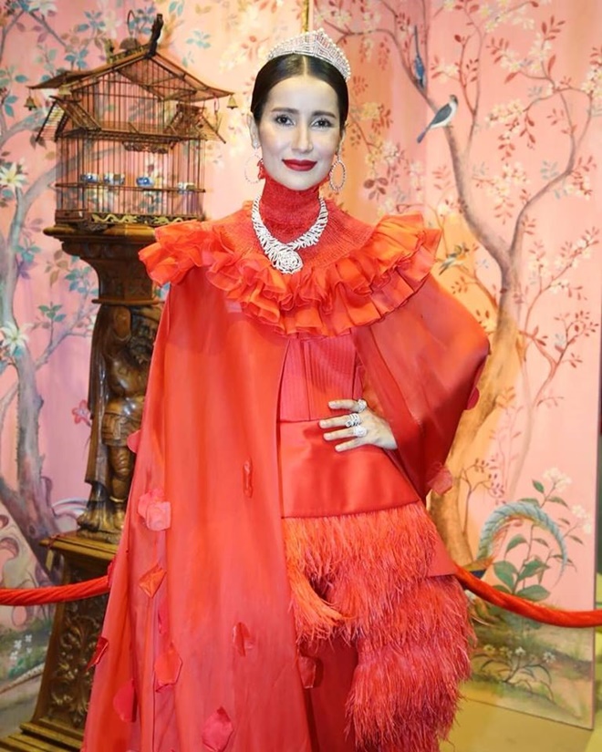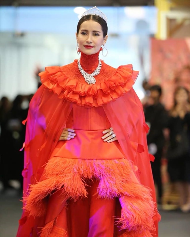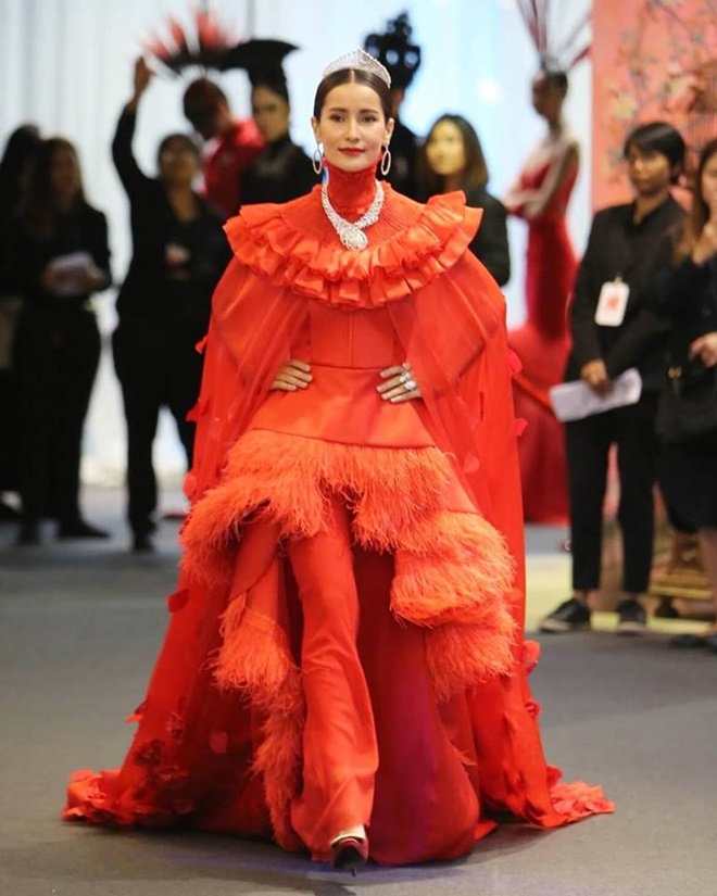 Anne Thongprasom khiến ai ai cũng phải ngắm nhìn khi diện đầm lông vũ màu đỏ chói cùng cách make up tông xuyệt tông.