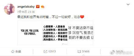 Tối ngày 16/7, Angelababy đăng bài viết như sau: “Gần đây tôi và thế giới có chút cách biệt, nhưng mọi thứ đã yên ổn” phối với các hình ảnh khác ghi “nhân sinh kiến nghị: Biết càng ít người càng tốt, đừng chung đụng với những người không thích hợp với mình, tri kỷ một hai người là đủ rồi,…, đừng đi 'đánh giày' cho ai, kỳ tích của người khác không liên quan đến bạn, cái lấy không được thì đừng nên đuổi theo, những thứ làm bản thân mình tức giận thì đừng quan tâm đến nó”.