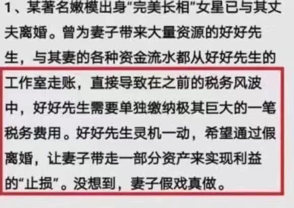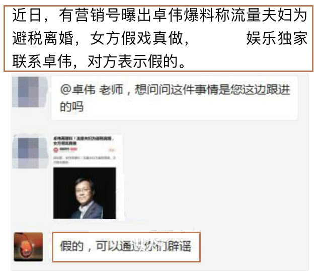 Được biết, tin đồn này có cư dân mạng tiết lộ là do Trác Vỹ đã đăng trong vòng bạn bè cho biết: Ông đã đưa truyền thông tin tức một cặp vợ chồng đã ly hôn và nữ minh tinh này xuất thân từ nghề người mẫu. Nguyên nhân dẫn đến ly hôn là do phía nam cần phải bổ sung một khoản thuế cực lớn nên cả hai đề xuất ly hôn giả, nhưng không ngờ từ giả làm thật, hai vị lưu lượng minh tinh đó đến nay đã thật sự ly hôn rồi.