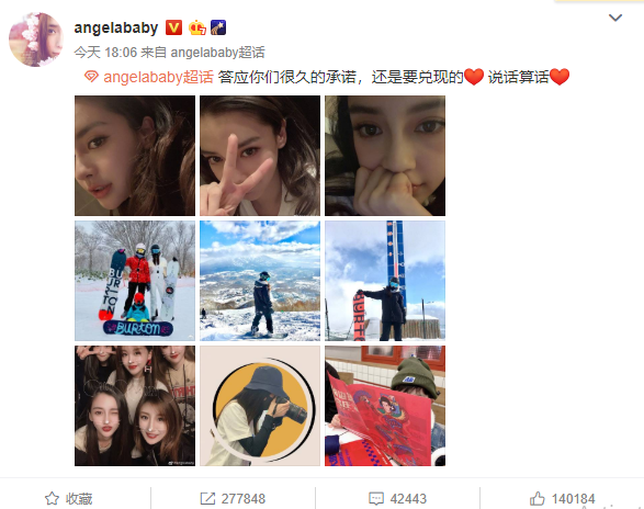 Angelababy đã đăng tải một loạt ảnh selfie của bản thân và những gì xuất hiện trong cuộc sống hằng ngày lên trang cá nhân của mình với nội dung: “Hứa với mấy bạn đã lâu rồi đến giờ phải thực hiện nó thôi, nói thì phải giữ lời“. Trong loạt ảnh selife, Angelababy đã có nhiều cử chỉ khác nhau để làm mới lạ hình ảnh hơn, và đôi mắt đầy mị lực của cô nàng vẫn là điểm sáng nhất trên gương mặt.