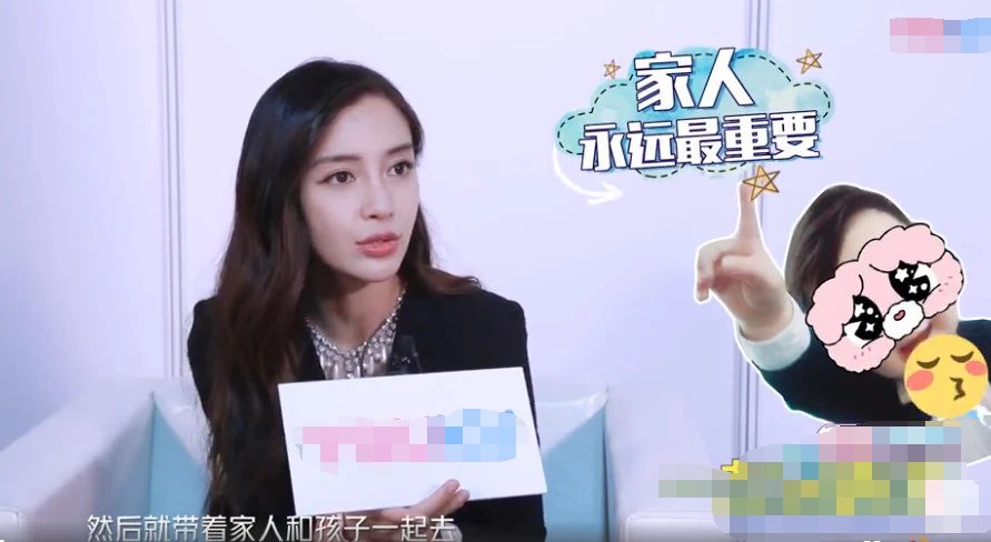 Angelababy cho biết gia đình lúc cô bận công việc đã đi tham quan rất nhiều nơi. Trong mắt Angelababy, gia đình vĩnh viễn là quan trọng nhất. Có điều, không phải diễn viên nào cũng nghĩ như vậy như Dương Mịch chẳng hạn, trong lúc phỏng vấn thì Dương Mịch cho biết làm diễn viên mới là điều đứng đầu.