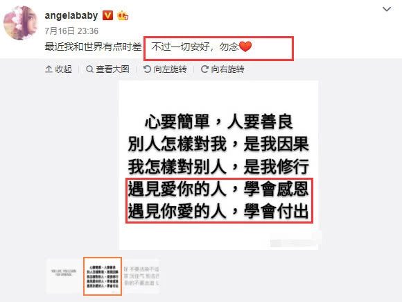 Trước đó vào ngày 16 tháng 7, Angelababy đột nhiên đăng bài lên weibo cá nhân, trong đó một trong ba tấm hình có dòng cảm khái: “Gặp được người yêu bạn, học cách cảm ơn. Gặp được người bạn yêu, học cách hy sinh”. Angelababy còn để lại lời bình: “Có điều mọi thứ đều tốt, đừng nhớ“. Có cư dân mạng đoán lẽ nào đây là vì hôn nhân sinh biến sao? Trong ngôn từ tràn đầy sự bi thương.
