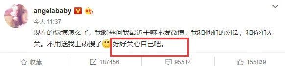 Đối mặt với sự tranh luận của cư dân mạng, Angelababy công khai đăng bài trả lời đây là đoạn đối thoại giữa cô và fan hâm mộ, hoàn toàn không có ý gì khác, hy vọng mọi người đừng đoán mò lung tung nữa. Ngoài ra Angelababy còn tức giận trả lời: “Không liên quan đến các người, không cần đưa tôi lên hot search, tự lo bản thân mình đi”