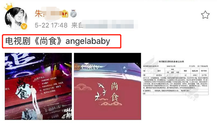 Ngoài ra tin tức còn cho biết, sắp tới Angelababy sẽ trở thành nữ chính trong phim mới do Vu Chính sản xuất mang tên Thượng thực. Để nhận được vai chính này, nàng tiểu hoa sẵn sàng hạ cát sê của mình đến mức thấp nhất chỉ còn ở 6 con số, thậm chí còn thấp hơn cả nghệ sỹ tuyến hai hay tuyến ba. Chính vì điều này đã khiến Vu Chính cảm động với động thái chân thành, muốn cải thiện diễn xuất của Angelababy. Thế nhưng, nhà sản xuất lại vô cùng lo lắng trước khả năng diễn xuất “trăm phim như một” của cô nàng.