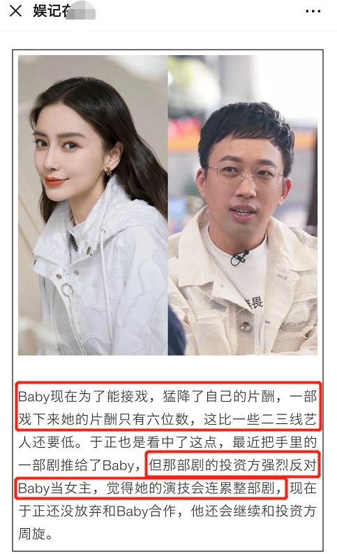 Trong mắt cư dân mạng, diễn xuất của Baby luôn là “trừng mắt há mồm”, kiểu diễn xuất đơ cứng khiến người xem cực kỳ khó chịu. Trước đây, thù lao diễn xuất trong Cô phương bất tự thưởng của Angelababy lên đến 80 triệu NDT (275 tỷ đồng), chưa kể nàng tiểu hoa còn lạm dụng vô tội vạ người đóng thế. Nói về mức cát sê cao ngất ngưởng, Angelababy bày tỏ cô đáng giá với mức thù lao này.