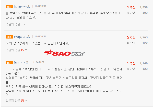 3. [+1,140, -123] Nếu khuyên chúng tôi nên giúp đỡ người tỵ nạn, thì bạn nên quyên góp toàn bộ tài sản thực của mình trước khi nói chuyện như thế này. Anh ấy không nhận ra đạo đức giả của mình hả? Anh ấy sở hữu căn hộ cao cấp ở Gangnam và sống trong như một đại gia trong khi yêu cầu chúng tôi giúp người tị nạn sao?