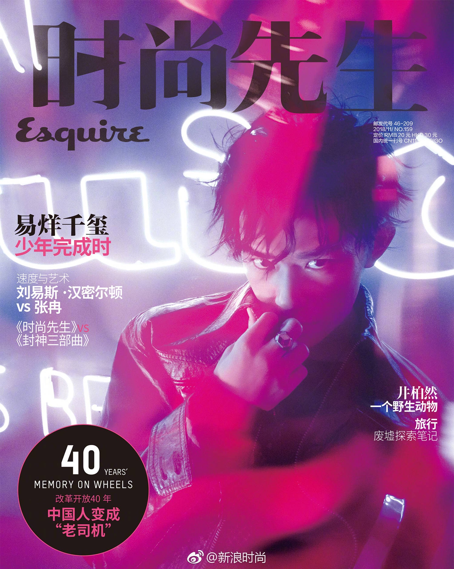 Vừa qua, tạp chí Esquire đã đăng loạt ảnh mới của Dịch Dương Thiên Tỉ nhóm nhạc nam TFBOYS trên trang bìa số ra tháng 11 lên mạng xã hội Weibo kèm theo dòng trạng thái: “Giữa ánh sáng và bóng tối, chàng trai trẻ xuất hiện; bên trong và bên ngoài ống kính, cậu tự do phát triển. Ở dưới độ tuổi 18, Dịch Dương Thiên Tỉ đã chia sẻ những triết lý sống nhất quán phù hợp với mình, cậu nói 'Em luôn muốn thay đổi, bất kể tốt hay xấu, em sẽ luôn tìm kiếm những gì em thực sự thích. Em hy vọng mình không để bản thân mình thất vọng'.