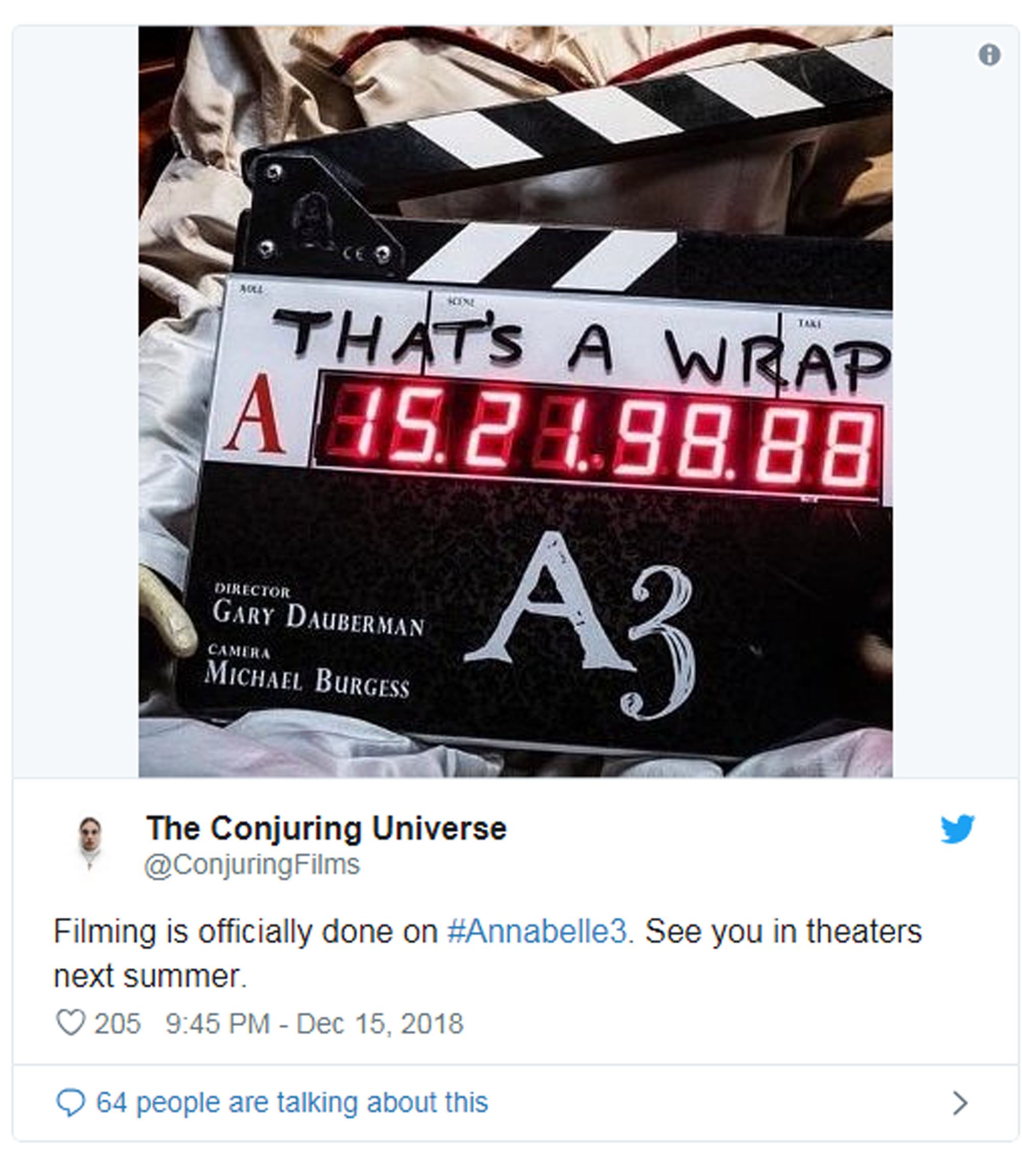 Annabelle 3 chính thức hoàn thành các cảnh quay. Hẹn gặp lại ở rạp chiếu phim vào mùa hè tới.