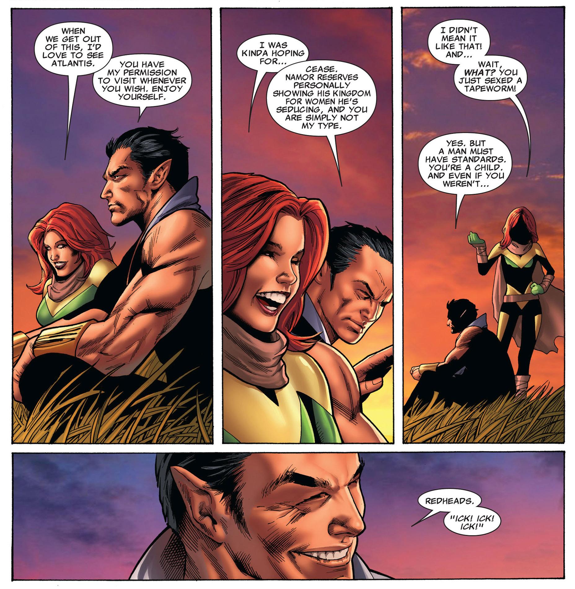 Tuy nhiên, ở cuối issue, Namor đã tiết lộ rằng cô bé Hope không phải gu của hắn, và Hope đã giật mình hỏi hắn rằng “Đợi đã, gì cơ? Anh chỉ thích quan hệ với một con SÁN DÂY hả!”.