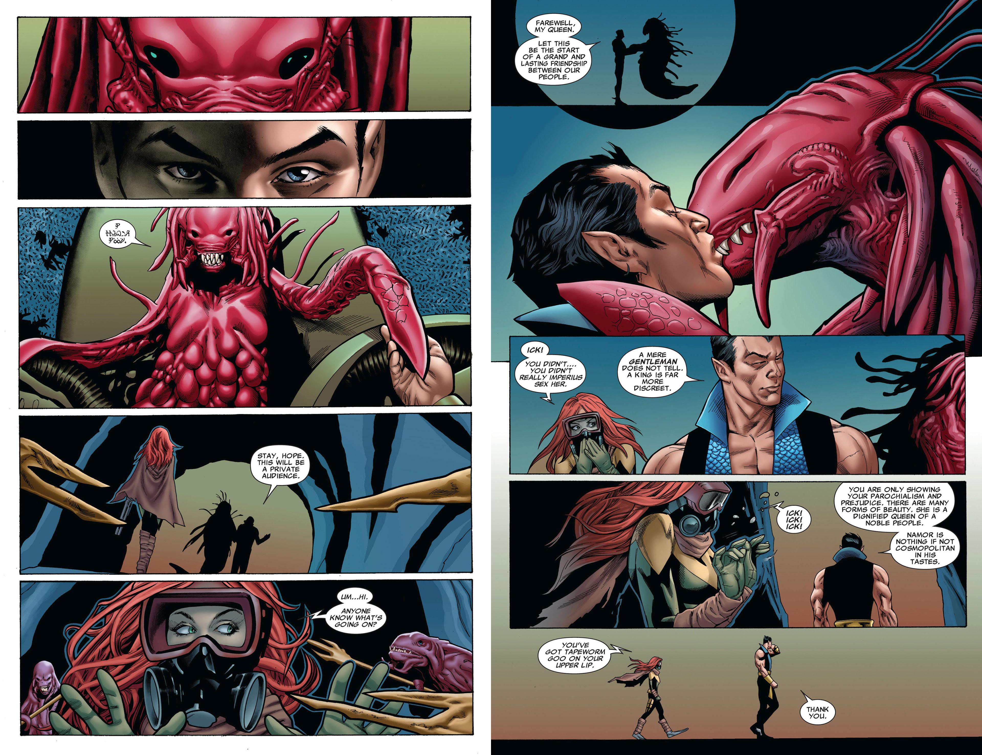 Tình huống diễn ra trong issue 8 của Uncanny X-Men Vol. 2, khi X-Men đang cố gắng giúp một chủng loại sinh vật có tế bào bị chuyển hóa xấu giống như ung thư do ánh sáng mặt trời. Trong khi đó, Namor cố gắng tạo hòa bình với các sinh vật biển lạ bằng cách đi cùng lãnh đạo của họ là The River Queen (một con quái vật có xúc tua ngoằn ngoèo) vào một phòng riêng để đánh dấu thỏa thuận “tình bạn” giữa các loài. Khi Hope Summers nhìn thấy họ hôn nhau, cô bé đã hỏi: “Anh đã không… Anh đã không thực sự “mây mưa” với cô ta chứ?”