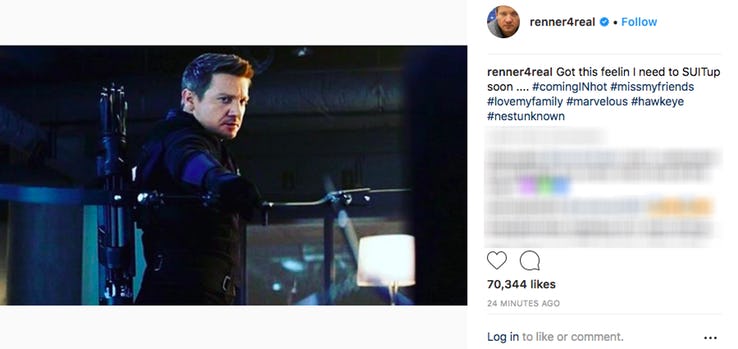 Mới đây, Jeremy Renner đã đăng một bức ảnh trên Instagram với mục đích trêu chọc sự trở lại của mình. Anh đã sử dụng một bức ảnh từ Captain America: Civil War (đây là bộ phim anh xuất hiện cuối cùng trước khi biến mất tạm thời). Bỏ qua một số hashtags như #missmyfriends và #lovemyfamily, hashtags #nestunknown đã khiến khán giả càng cảm thấy bị ẩn về vị trí của Hawkeye trong Avengers 4.