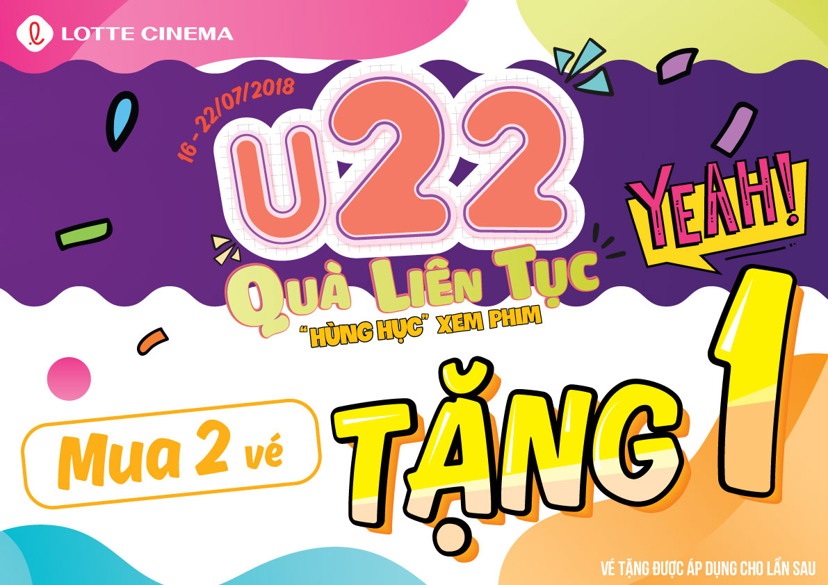 Ngoài chương trình giá vé 45k thì Lotte Cinema đang có chương trình ưu đãi thêm cho các bạn U22, nhận quà liên tục hùng hục xem phim. U22 chỉ cần mua 2 vé xem phim sẽ nhận được 1 vé xem phim miễn phí cho lần sử dụng sau.
