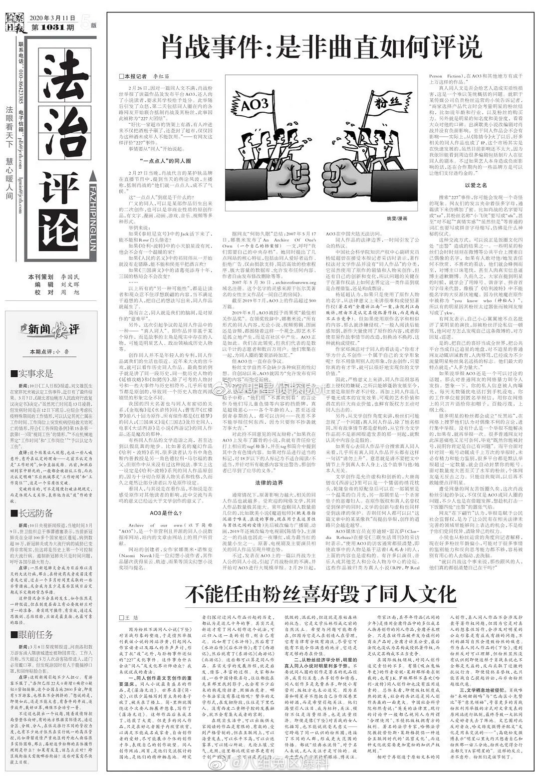 Ngày 11 tháng 3, Kiểm Sát Nhật Báo (truyền thông được quản lý bởi Trung ương) đã xuất bản liên tiếp 3 bài báo để phân tích vụ việc của Tiêu Chiến. Thậm chí, tài khoản Weibo chính thức của Kiểm sát Nhật Bảo còn đính một trong ba bài viết với tiêu đề “Chuyện của Tiêu Chiến: Làm thế nào để phân biệt đúng sai” lên trang đầu để cảnh báo sự ảnh hưởng của chuyện này có bao nhiêu phần nghiêm trọng. Kiểm Sát Nhật Báo là cơ quan báo chí cao nhất của Viện kiểm sát Nhân Dân, được thành lập năm 1991, có địa vị và quyền tự do ngôn luận nhất định.