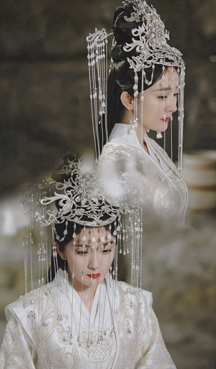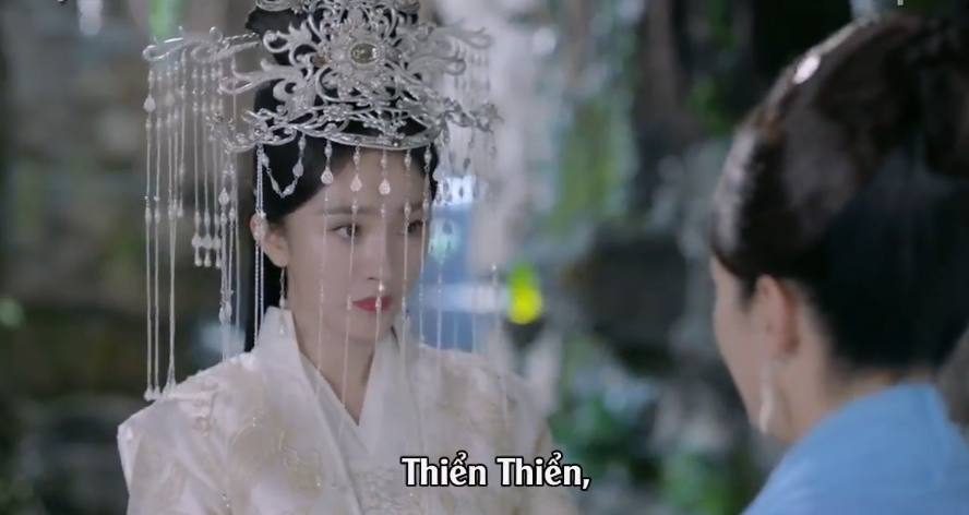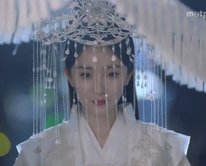 Y phục hôn lễ của Thiên hậu quả là vô cùng đặc sắc với một màu trắng vô cùng sang trọng. Trên đầu Bạch Thiển thượng thần đội mũ phượng với những chuỗi ngọc được buông xuống thành mạng che mặt. Tuy khuôn mặt Bạch Thiển chỉ ẩn hiện sau tấm mạng nhưng nét đẹp của Bạch Thiển vẫn còn nguyên vẹn như ngày nào, vẫn vô cùng thông minh, sắc sảo, nhưng cũng không kém phần quyến rũ, bí ẩn.