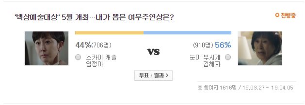 Bên cạnh đó, trên cổng thông tin Nate tại Hàn, đã có cuộc bình chọn với câu hỏi: “Giải thưởng nghệ thuật Baeksang lần thứ 55 tổ chức vào tháng 5. Nữ diễn viên xuất sắc nhất bạn chọn là ai?”. Theo kết quả bình chọn từ ngày 27/03 đến ngày 05/04 sắp tới, hiện tại Kim Hye Ja của phim Dazzling đài JTBC đã mang về 910 phiếu (56%). Trong khi, Yum Jung Ah của phim SKY Castle đài JTBC nhận được 706 phiếu (44%).
