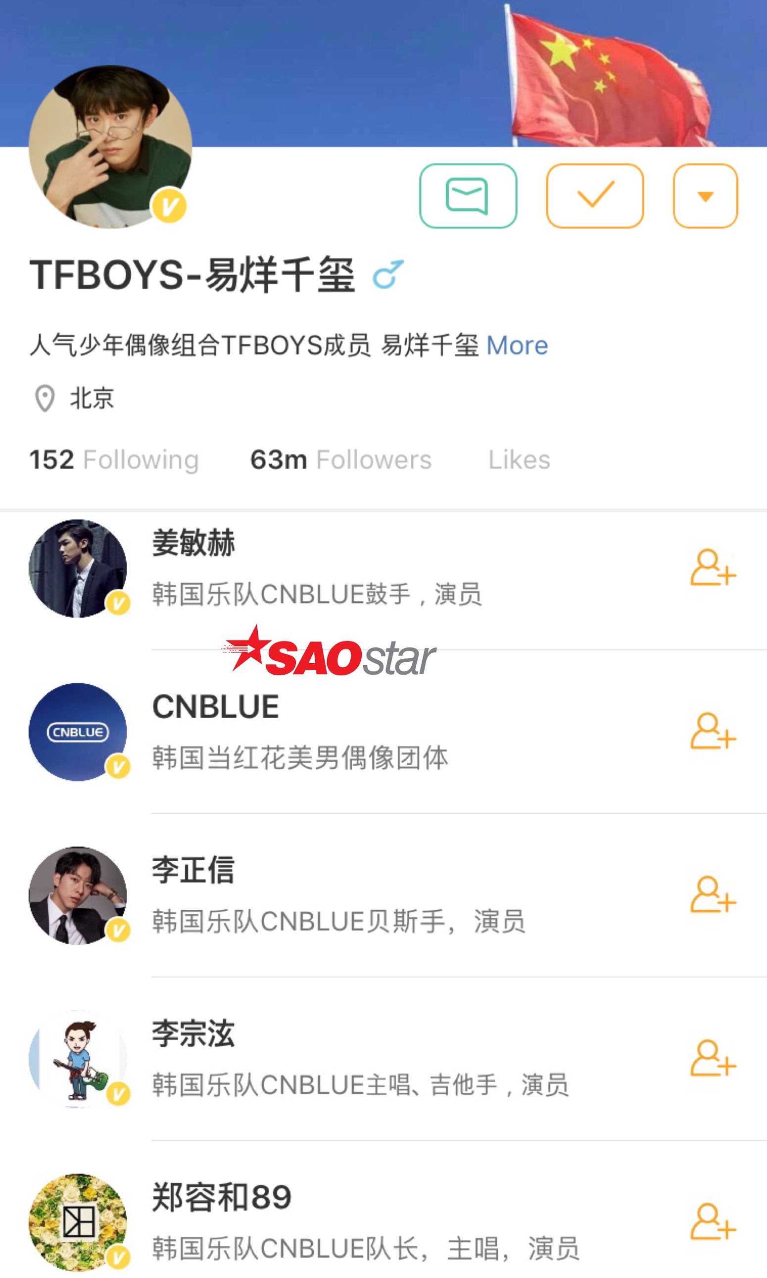 Ngoài TFBOYS, tài khoản Jung Yong Hwa thậm chí còn theo dõi Ngô Lỗi, Dương Dương, Phạm Băng Băng,..