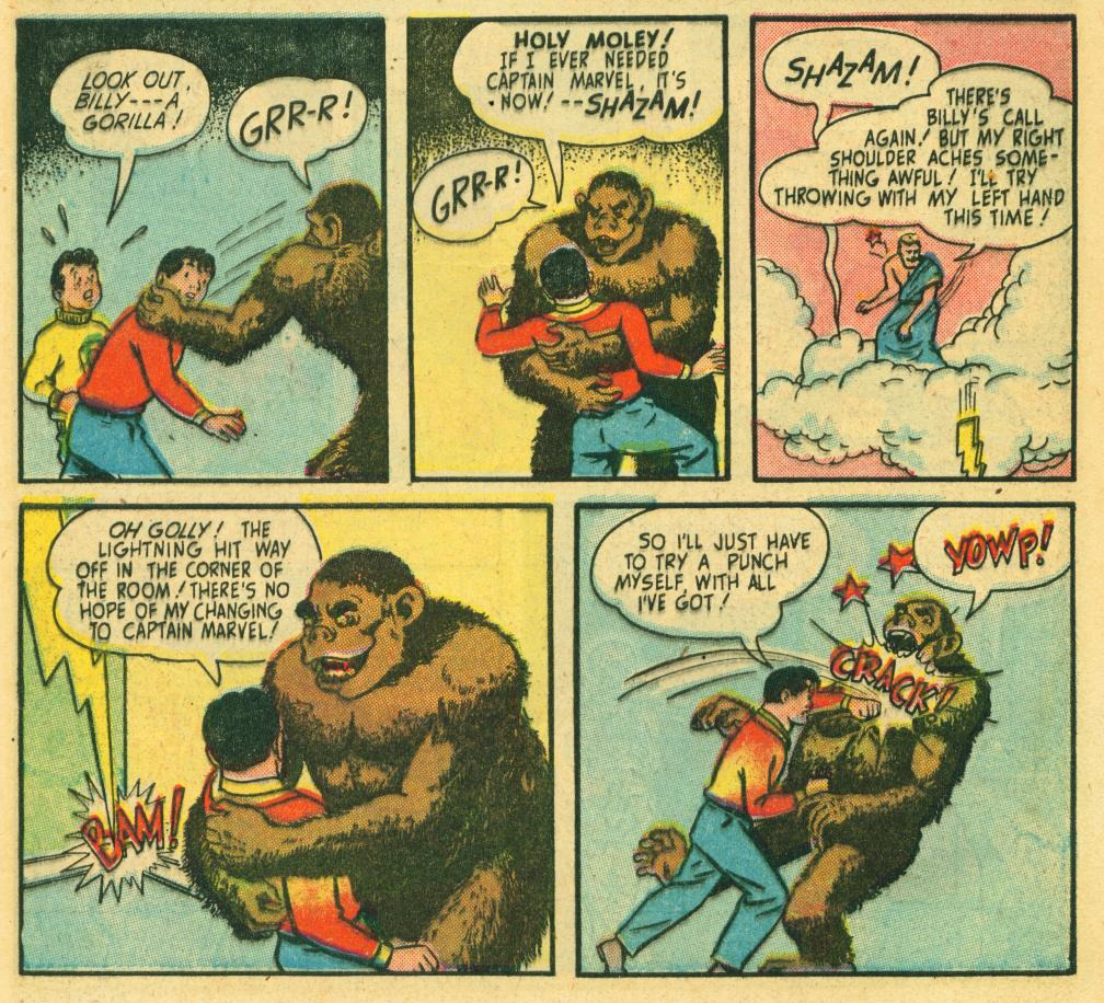Ngay sau đó, bất chấp việc mình đang ở trong tình trạng ko thể biến thành Captain Marvel, cậu vẫn quyết định chui vào ngôi nhà hoang để điều tra và bị 1 đám tội phạm vây bắt. Trong lúc nguy khốn, Billy lại réo gọi “Shazam!” để biến thành Captain Marvel nhằm đánh lại tên cướp Gorilla xấu xí, nhưng…