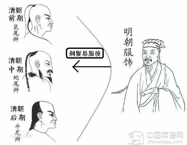 Trong lịch sử kiểu tóc của nam tử thời nhà Thanh được chia làm thành ba giai đoạn: Bím tóc đuôi chuột - tiền kỳ của nhà Thanh, bím tóc đuôi rắn - trung kỳ của nhà Thanh và tóc đuôi sam - hậu kỳ thời nhà Thanh.