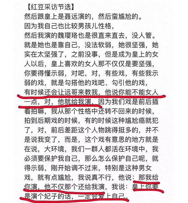 Có những phân cảnh yếu đuối, nhõng nhẽo cũng như câu dẫn (thu hút) Hoàng thượng nhưng Ngô Cẩn Ngôn không làm được phải nhờ đến Hoàng thượng - Nhiếp Viễn đích thân đứng ra chỉ dẫn. Thậm chí, Ngô Cẩn Ngôn còn cho rằng nếu đổi lại Nhiếp Viễn đến diễn vai phi tần nhất định cũng sẽ yêu bản thân mình. (Ý chỉ Nhiếp Viễn sẽ yêu bản thân mình). Và kết quả là những phân cảnh tay đôi với Nhiếp Viễn, Ngô Cẩn Ngôn cảm nhận được bản thân đã tiến bộ hơn rất nhiều so với lúc diễn đơn độc một mình.
