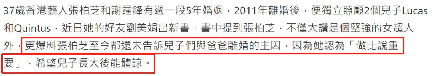 Thế nhưng, sau khi Trương Bá Chi ly hôn thì đó lại là thời kỳ khó khăn nhất của cô. Bạn thân Trương Bá Chi là Lưu Mỹ Quyên từng viết trong sách cho biết cô vô cùng chú trọng đến cảm nhận của con cái, sau khi ly hôn thì chưa từng nhắc đến lý do tại sao ly hôn với Tạ Đình Phong. Lưu Mỹ Quyên còn viết, hình dung Trương Bá Chi là một “nữ siêu nhân”, trong hoàn cảnh khó khăn nhất vẫn mạnh mẽ trở thành người mẹ đơn thân, ngày ngày ngồi xe bus công cộng, thuê nhà trọ ở Singapore.