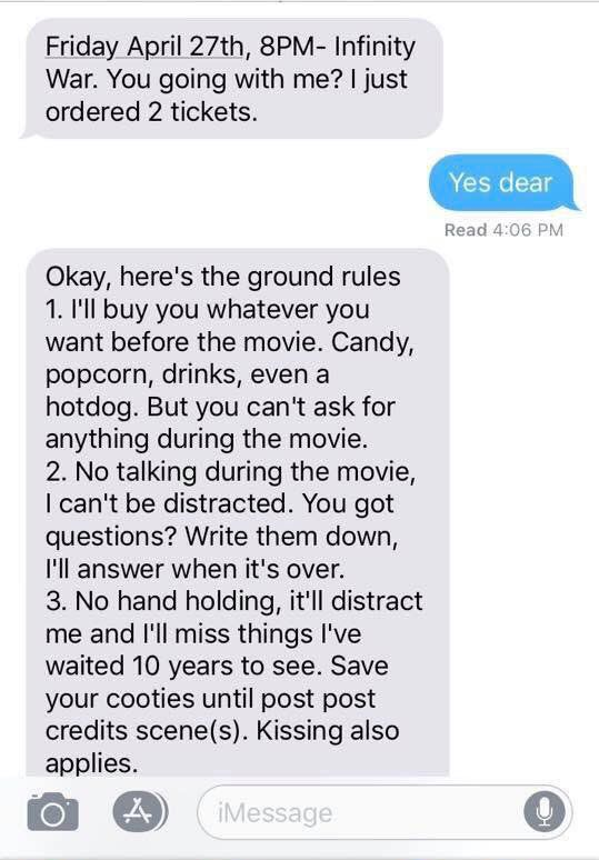 Đó cũng là lý do mà thời gian gần đây, trên mạng xã hội liên tục xuất hiện “Nội quy khi cùng bạn trai đi xem Avengers”. Theo đó, nắm tay, ôm hôn đều là điều tối kỵ, thậm chí, nếu các cô nàng có thắc mắc thì phải viết ra giấy để chờ người yêu trả lời lúc hết phim!