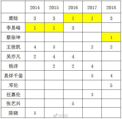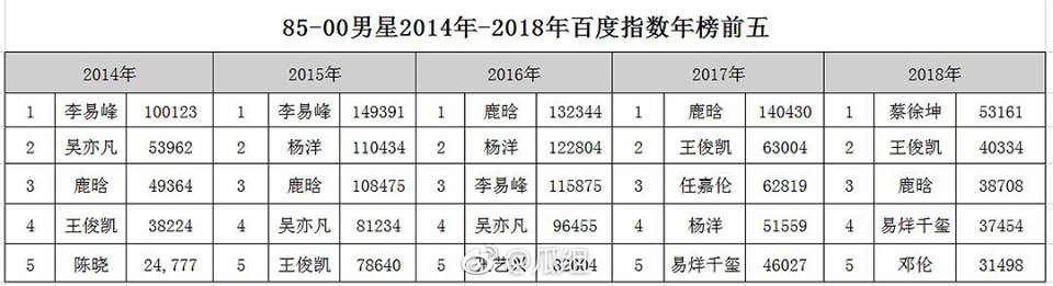 Mới đây trên Weibo đang lan truyền Bảng chỉ số Baidu từ năm 2014 - 2018 của những tiểu sinh hậu 85 - 00. Danh sách này có sự góp mặt của “tứ đại lưu lượng” Lý Dịch Phong, Dương Dương, Lộc Hàm, Ngô Diệc Phàm, hai thành viên của TFBoys Vương Tuấn Khải, Dịch Dương Thiên Tỉ và ngôi sao mới nổi tiếng nhất năm 2018 Thái Từ Khôn. Trong đó Lộc Hàm là ngôi sao duy nhất có mặt đủ trong 5 năm liền, anh cùng Lý Dịch Phong cũng là hai ngôi sao đứng đầu nhiều nhất với 2 lần mỗi người.