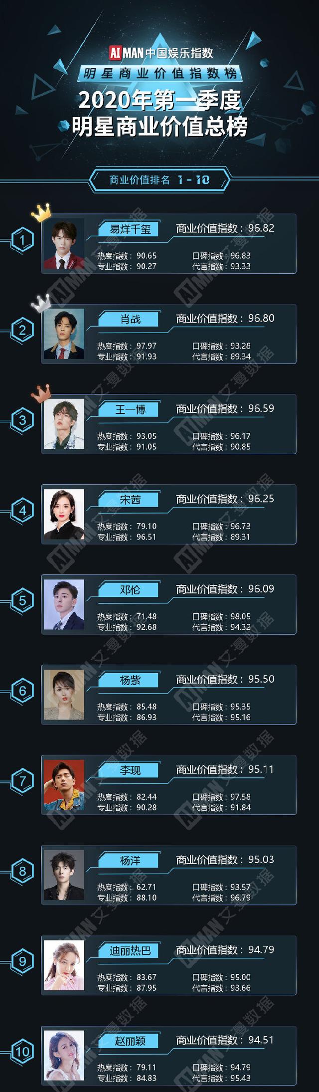 Ngoài bảng đề cử top 100 gương mặt có sức ảnh hưởng trong năm 2020 thì còn có rất nhiều bảng xếp hạng ảnh hưởng khác đã được công bố kết quả như giá trị thương mại, trang bìa tạp chí,… Trong Bảng xếp hạng giá trị thương mại của quý I/2020, nghệ sĩ đứng ở top 10 gồm có Dịch Dương Thiên Tỉ, Tiêu Chiến, Vương Nhất Bác, Tống Thiến, Đặng Luân, Dương Tử, Lý Hiện, Dương Dương, Địch Lệ Nhiệt Ba và Triệu Lệ Dĩnh.