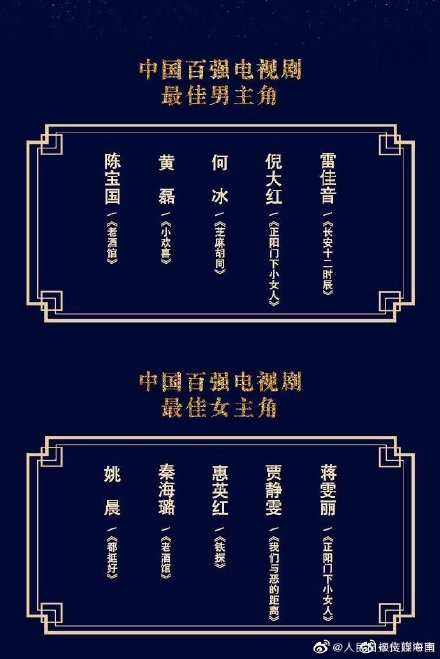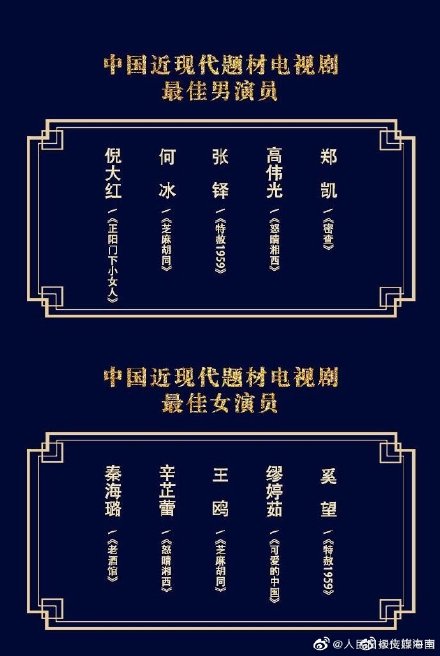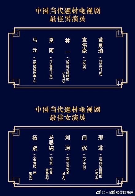 - Nam diễn diễn viên chính xuất sắc nhất phim truyền hình đề tài đương đại: Mã Nguyên, Hạ Vũ, Lâm Nhất, Viên Vỹ Hào, Hoàng Cảnh Du