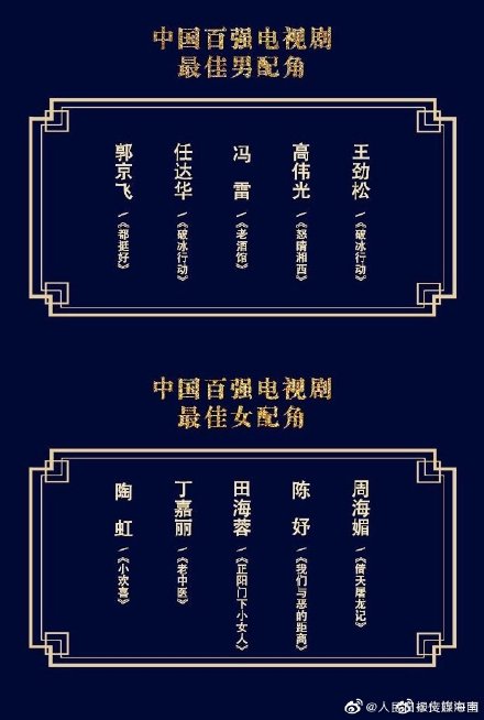 - Nam diễn viên phụ xuất sắc nhất phim truyền hình: Quách Kinh Phi, Nhậm Đạt Hoa, Phùng Lôi, Cao Vỹ Quang, Vương Kính Tùng