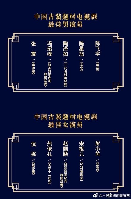 - Nữ diễn viên chính xuất sắc nhất phim truyền hình đề tài cổ trang: Nghê Ni, Nhiệt Y Trát, Triệu Lệ Dĩnh, Tống Tổ Nhi, Bành Tiểu Nhiễm