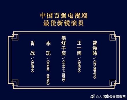- Diễn viên mới xuất sắc nhất phim truyền hình : Tiêu Chiến, Lý Hiện, Dịch Dương Thiên Tỉ , Vương Nhất Bác, Tằng Thuấn Hy