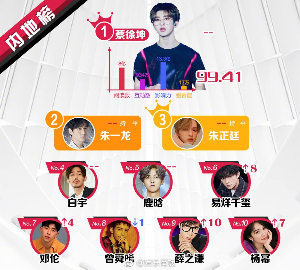 Ngoài ra trong danh sách còn có bộ đôi của Trấn hồn là Chu Nhất Long và Bạch Vũ. Trấn hồn hiện đang là một trong những bộ phim hot nhất nhì màn ảnh, không có gì lạ khi “Trấn hồn huynh đệ” cùng góp mặt trong bảng này. Chu Chính Đình, Lộc Hàm, Dịch Dương Thiên Tỉ, Đặng Luân, Tằng Thuấn Hy, Tiết Chi Khiêm và Dương Mịch là những cái tên còn lại trong danh sách.
