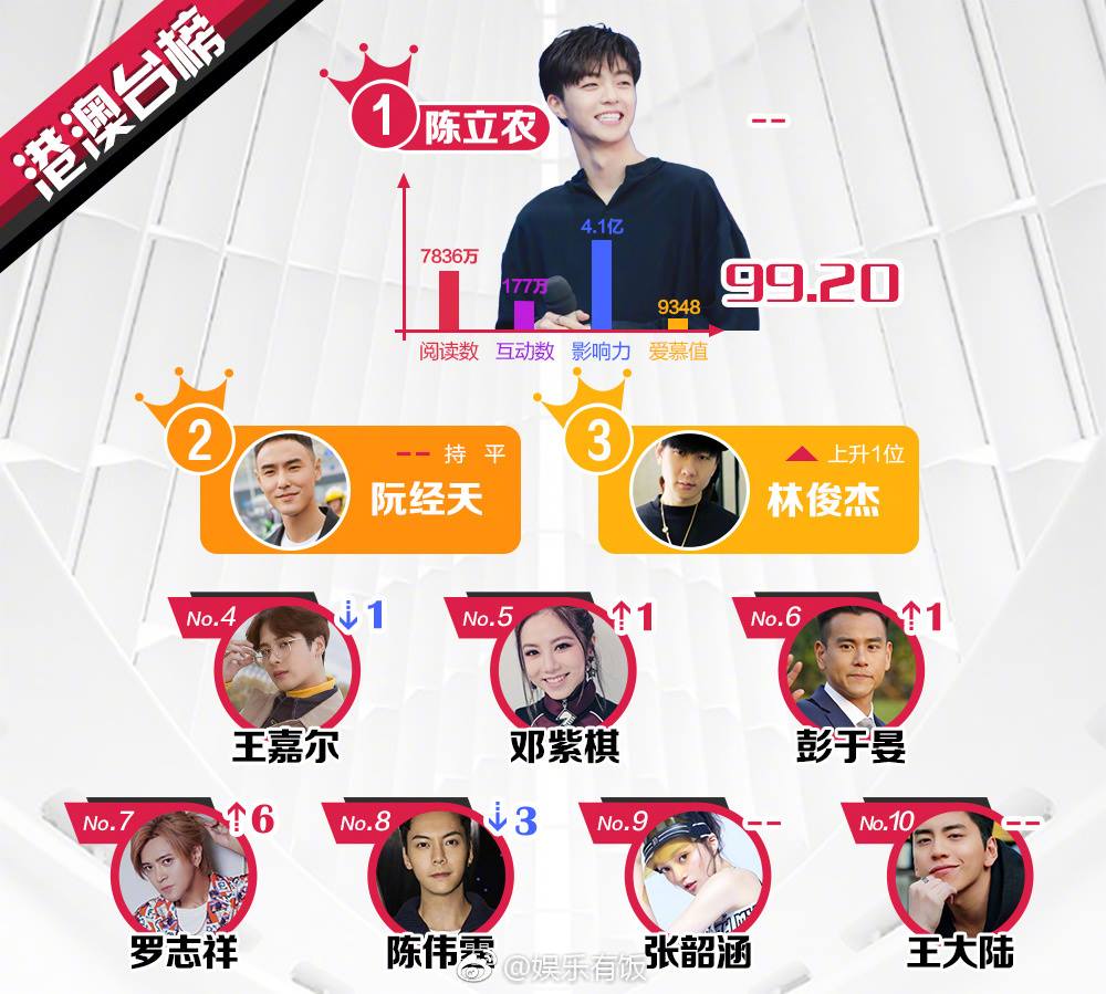Bảng thế lực minh tinh của Hong Kong - Đài Loan cũng không có nhiều thay đổi so với tuần trước. Thành viên đến từ Đài Loan của Nine Percent là Trần Lập Nông tiếp tục đứng đầu bên cạnh người đồng đội Thái Từ Khôn. Đứng ngay sau Trần Lập Nông chính là sao nam của Phù Dao - Nguyễn Kinh Thiên. So với bạn diễn Dương Mịch thì Nguyễn Kinh Thiên có vị trí cao hơn nhiều. Bành Vu Yến, Trần Vỹ Đình và Vương Đại Lục tuy thời gian gần đây không có quá nhiều hoạt động nhưng vẫn lọt vào danh sách. Ngoài những cái tên đã kể trên ra thì bảng Hong Kong - Đại Lục còn có Lâm Tuấn Kiệt, Vương Gia Nhĩ, Đặng Tử Kỳ, La Chí Tường và Trương Thiều Hàm.