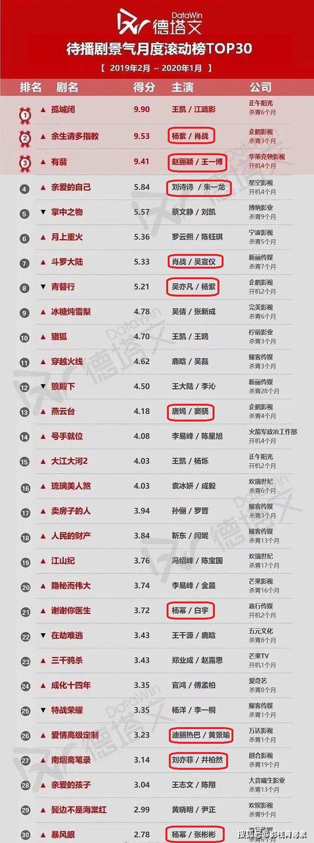 Trong khi đó, Yến vân đài do Đường Yên và Đậu Kiêu đảm nhận vai chính xếp vị trí thứ 13 trên bảng xếp hạng. Yến vân đài là bộ phim khởi quay trong lúc Đường Yên đang mang thai, là bộ phim cuối cùng sau khi cô nghỉ sinh nên rất đáng được chú ý. Nam yên trai bút lục do Lưu Diệc Phi và Tỉnh Bách Nhiên đảm nhận vai chính xếp vị trí thứ 27 - là bộ phim truyền hình của Lưu Diệc Phi sau 14 năm xa cách, cũng đáng được mong đợi.