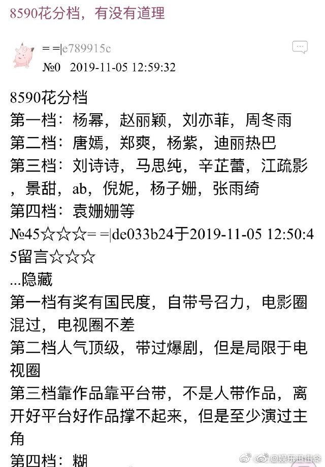 Hạng 1 gồm những cái tên như Dương Mịch, Triệu Lệ Dĩnh, Lưu Diệc Phi và Châu Đông Vũ.