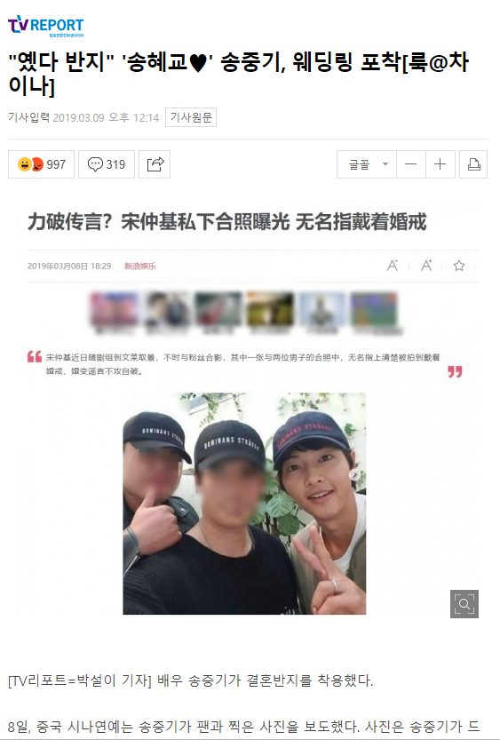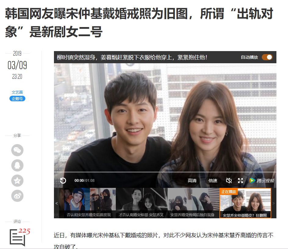 Vào tối ngày 09/03 vừa qua, tờ báo Newqq của Trung Quốc bất ngờ đăng tin với tiêu đề “Cư dân mạng Hàn Quốc phơi bày chiếc nhẫn cưới trên tay của Song Joong Ki là hình ảnh cũ”. Họ nói rằng một số phương tiện truyền thông tiết lộ bức ảnh đã đeo nhẫn cưới sau chuyến đi từ Brunei trở về nhà. Cư dân mạng tin rằng chuyện ly hôn của hai ngôi sao không đúng sự thật.
