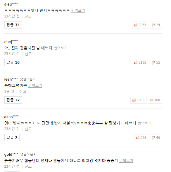 “ㅋㅋㅋㅋㅋㅋㅋNhân đây rồi ㅋㅋㅋㅋㅋㅋ”, “Ah… Thực sự hình kết hôn rất đẹp luôn”, “Song Hye Kyo thật xinh đẹp”, “Đeo nhẫn rồi ㅋㅋㅋ Mình cũng nên đeo lại nhẫn cưới nhỉ? ㅋㅋㅋ Song Song couple đẹp trai xinh gái”, “Diễn viên Song Joong Ki chắc là mệt mỏi lắm, nhưng mà lúc nào cũng lịch sự với các fan cả”, “Bức ảnh nhìn Song Hye Kyo như nữ thần, khuôn mặt chị ấy khiến tôi phát điên luôn”, “Mỗi lần xem ảnh cưới là mê mẩn”, “Nhà báo bên Trung viết kịch bản thật dễ sợ good”.