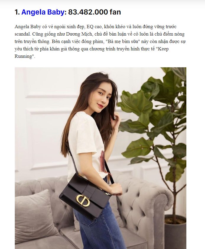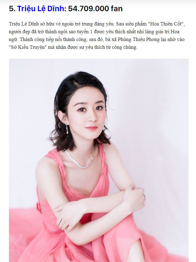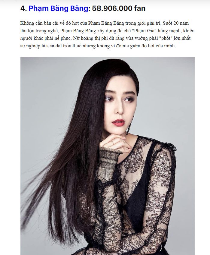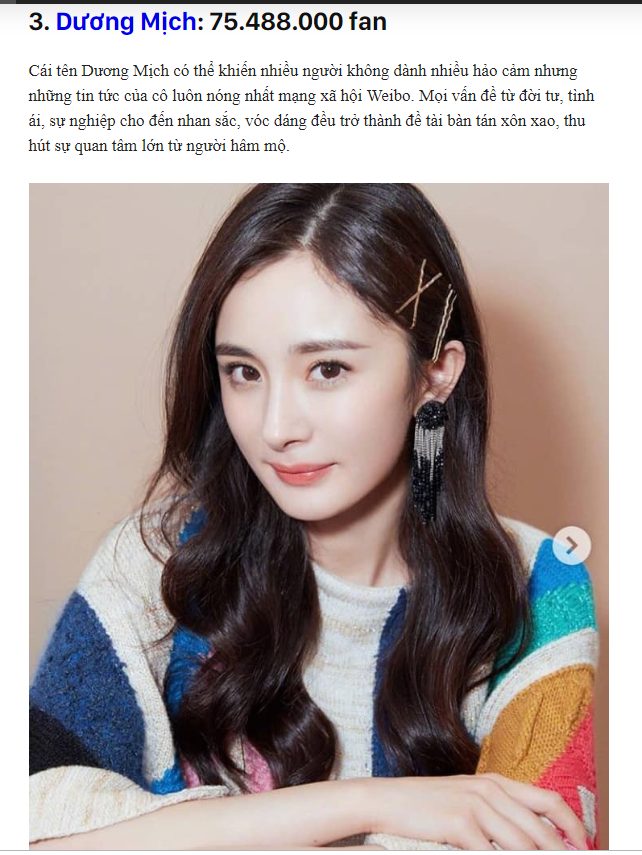 Vào trưa ngày 17/07, một tờ báo Việt đã đưa sai thông tin số liệu fan trên Weibo của các ngôi sao nữ Trung Quốc như Triệu Lệ Dĩnh, Phạm Băng Băng, Dương Mịch, Angelababy khiến người hâm mộ tức giận. Cụ thể, những con số được đưa ra đã cũ cách đây 1 năm, ở thời điểm này, vị trí thứ hạng hoàn toàn thay đổi và chênh lệch khá lớn…