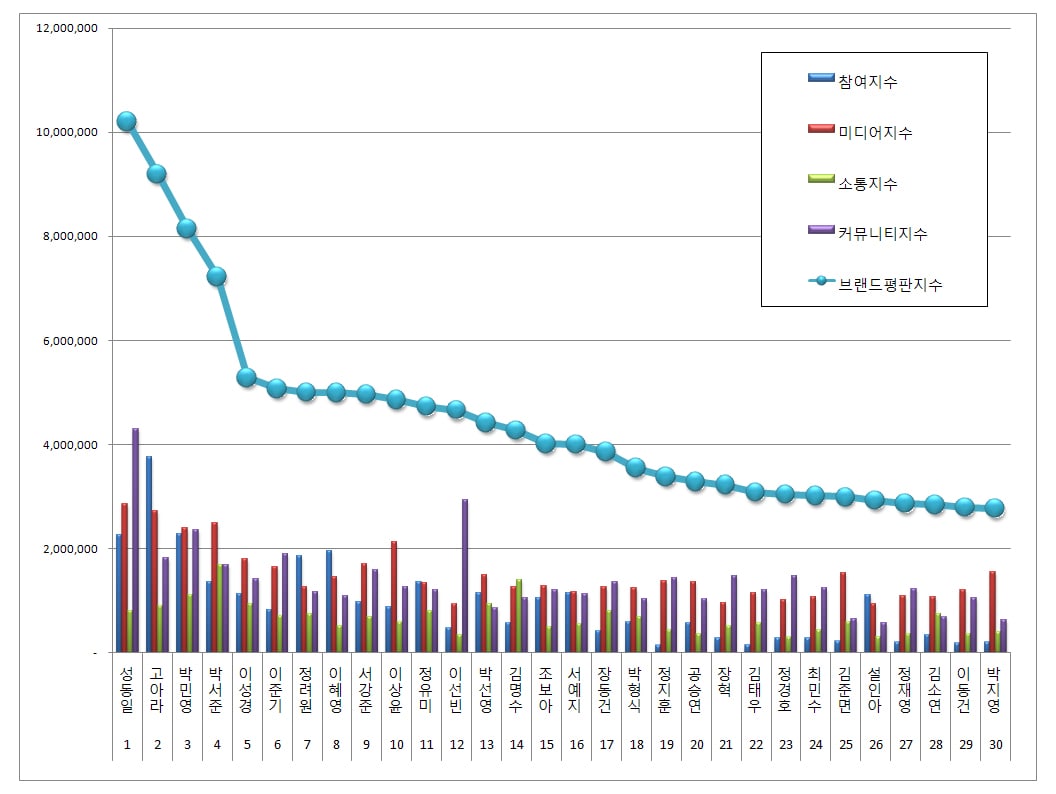 Sung Dong Il, nam diễn viên hiện đang đóng vai chính trong bộ phim truyền hình Miss Hammurabi (Quý cô Hammurabi) đài JTBC, vinh dự đứng đầu với chỉ số thương hiệu là 10.201.457 điểm. Những từ khóa liên quan đến thứ hạng cao nhất của Sung Dong Il là “vui vẻ”, “tốt” và “công bằng”. Bên cạnh đó, nam diễn viên nhận được 71,44% phản ứng tích cực.