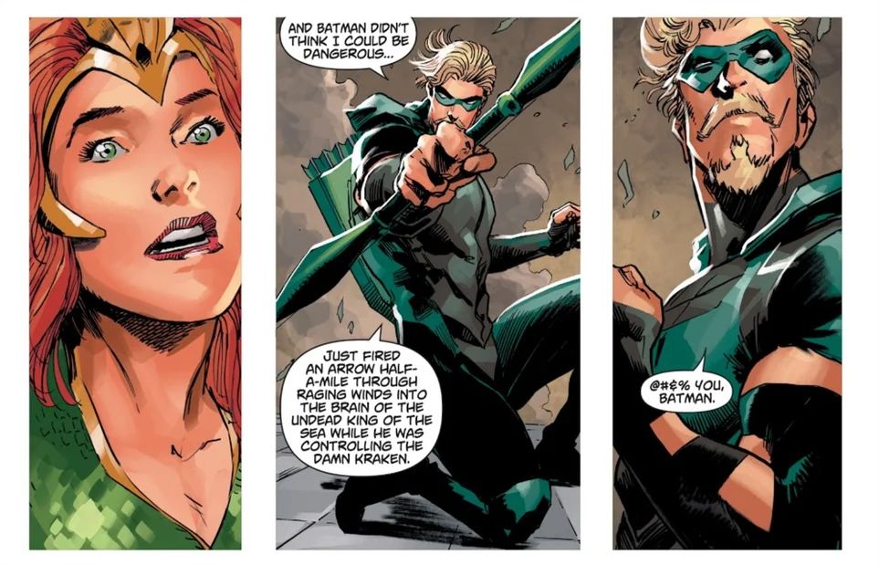 Cũng trong tập truyện DCeased #6, sau khi Xạ thủ xanh hạ gục Aquaman đang chịu sự kiểm soát bởi loại thủy quái Kraken bằng một mũi tên cách đó nửa dặm. xuyên qua làn mưa gió bão bùng, Oliver tự nhủ thầm: “F*** you Batman”.