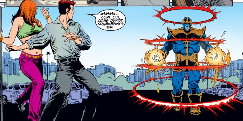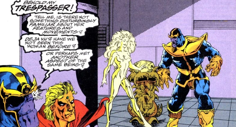 Rất nhiều người hâm mộ đã quên mất rằng Thanos không phải là “trùm cuối” của tập truyện Infinity Gauntlet. Hắn đã rất cố gắng hủy diệt vũ trụ để lấy lòng Death trong nửa đầu câu chuyện và sau đó bị đánh bại bởi các siêu anh hùng. Hắn cũng mất luôn quyền kiểm soát Găng Tay Vô Cực. Sau đó, chiếc găng về tay Nebula - cô con gái nuôi trước nay vẫn luôn căm hận Thanos và cô nàng đã dùng nó để “hất” luôn cha mình ra ngoài vũ trụ. Nebula thiếu khả năng kiểm soát chiếc găng và bắt đầu có xu hướng hủy diệt vũ trụ. Cuối cùng, Thanos đành hợp sức với một nhóm vài siêu anh hùng được dẫn dắt bởi Doctor Strange để ngăn chặn Nebula