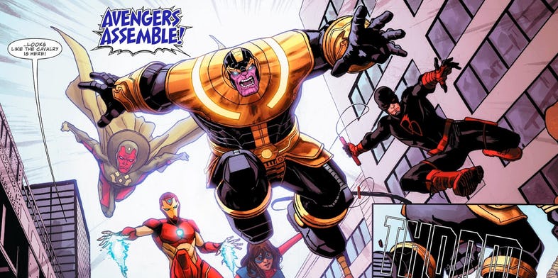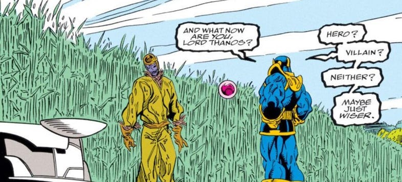 Mặc dù không thực sự xảy ra trong mạch truyện của Marvel nhưng trong series solo của mình, Thanos đã được dịp chứng kiến một thế giới mà ở đó hắn là một siêu anh hùng. Thanos dẫn đầu Biệt Đội Báo Thù và kề vai sát cánh cùng những cái tên như Iron Man, Ms. Marvel, Daredevil và Vision. Đa số các nhân vật phản diện khác sẽ thể hiện thái độ khinh bỉ với viễn cảnh này nhưng Thanos lại đặc biệt thích thú một thế giới được mọi người yêu mến và kính trọng. Trên thực tế, Thanos chỉ quyết định “chung thuyền” với các siêu anh hùng nếu như điều đó có lợi cho hắn.