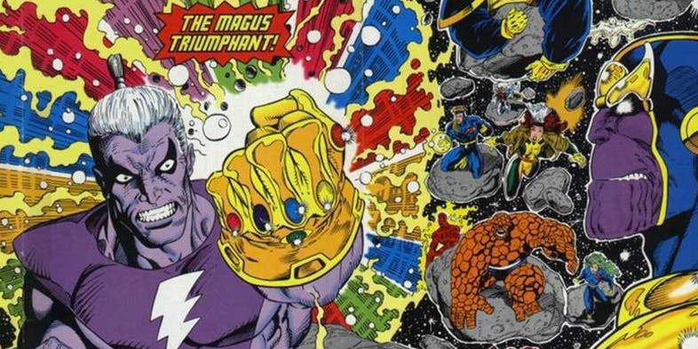 Tình trạng mối quan hệ của Adam Warlock và Thanos vẫn luôn bấp bênh từ trước đến nay. Khi thì là kẻ thù, lúc lại là đồng minh, và yếu tố quyết định chính là sự tồn tại của một nửa tà ác trong Warlock mang tên là Magus. Một lần nọ, Magus đã “trỗi dậy” và quyết định đối đầu với Thanos nhằm cướp chiếc Găng Tay Vô Cực. Magus muốn hủy diệt tất cả các vũ trụ và “thực tại”chính là cái hắn nhắm đến trước tiên. Thanos sau đó đã nhờ đến sự giúp đỡ của các siêu anh hùng nhưng lại bị từ chối (và điều này hoàn toàn dễ hiểu). Cuối cùng thì hắn đành “tự thân vận động” và hạ gục thành công Magus.