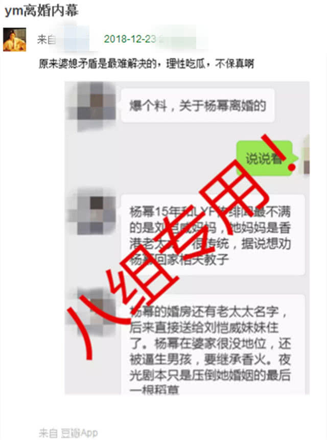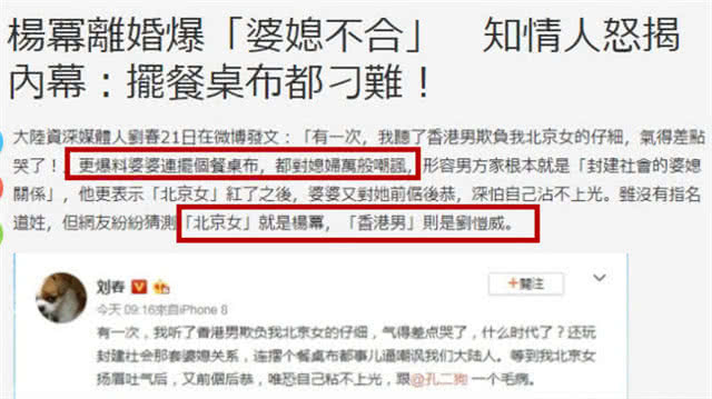 Hàng loạt các tờ báo xứ Cảng Thơm Hong Kong đưa tin: Dương Mịch ly hôn là vì mâu thuẫn mẹ chồng nàng dâu. Vào thời điểm đó, người trong cuộc tiết lộ rằng mẹ của Lưu Khải Uy mỗi lần tổ chức tiệc tại nhà đều gây khó dễ Dương Mịch. Về sau khi con dâu của mình ngày càng nổi tiếng, bà liền thay đổi sắc mặt, đối đãi có phần dễ dàng hơn với Dương Mịch. Nàng tiểu hoa trước nay với tính cách mạnh mẽ, không chịu thiệt thòi, khi cưới chồng lại không thể ngờ được mẹ chồng mình lại là kiểu người như vậy.