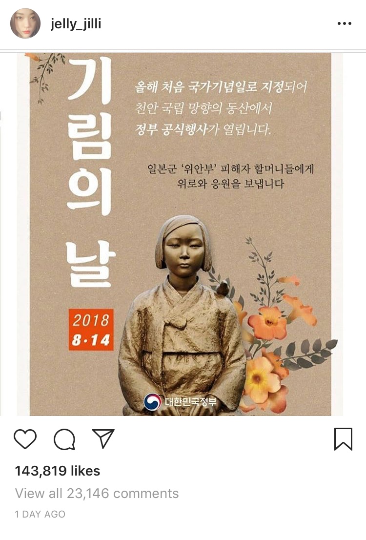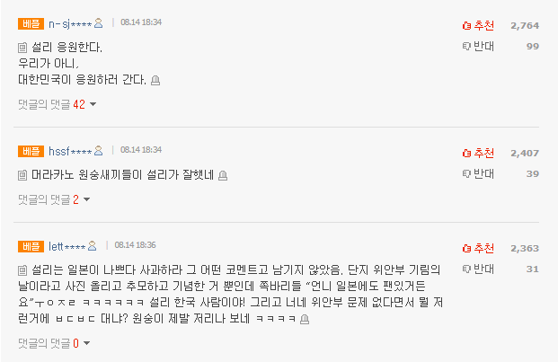 3. [+377, -7] Sulli chưa bao giờ nhắc đến Nhật Bản hay yêu cầu Nhật Bản phải xin lỗi. Cô ấy chỉ đơn giản đăng một bức poster nhân ngày Phụ nữ giải khuây để an ủi và những cư dân mạng Nhật Bản có ý kiến như kiểu “unni, chị cũng có fan ở Nhật”.ㅋㅋㅋ ㅋㅋㅋ Sulli là người Hàn Quốc nhé! Và nếu các bạn có thấy vô tội khi đối mặt với những nạn nhân không, tại sao các bạn lại nổi điên trong bài đăng của cô ấy? ㅋ ㅋㅋㅋ ㅋㅋㅋ