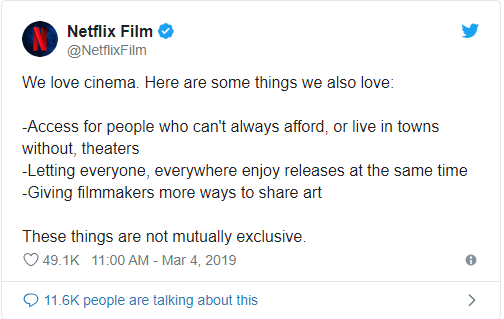 Có thể thấy màn phản pháo của Netflix vừa có lý vừa có tình, đúng là trong thời gian qua dịch vụ này đã cung cấp giải pháp giải trí điện ảnh vừa tiết kiệm lại vô cùng đa dạng cho hàng triệu người trên thế giới. Năm nay tại Oscar Netflix đã thắng lớn khi bộ phim Roma của hãng này đem về tới 3 tượng vàng danh giá ở các hạng mục Quay phim, Đạo diễn và Phim nói tiếng nước ngoài xuất sắc.
