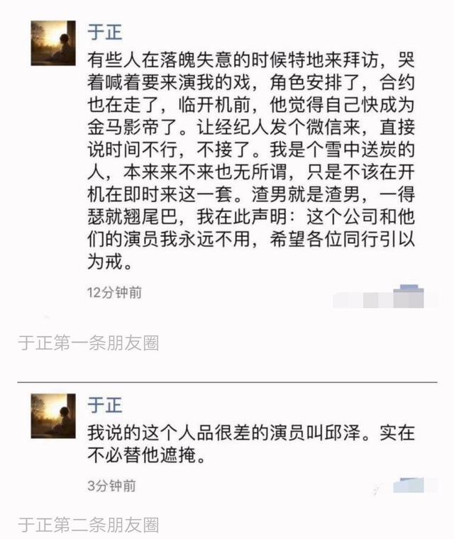 Bên cạnh đó còn một bài đăng khác của Vu Chính trực tiếp chỉ trích Khưu Trạch là người có nhân phẩm thấp với nội dung: “…Vừa được chút thành tựu đã lên mặt. Tôi ở đây lên tiếng thanh minh: ‘Công ty này và diễn viên của họ tôi mãi mãi không dùng…Diễn viên có nhân phẩm kém mà tôi muốn nhắc đến tên là Khưu Trạch…”