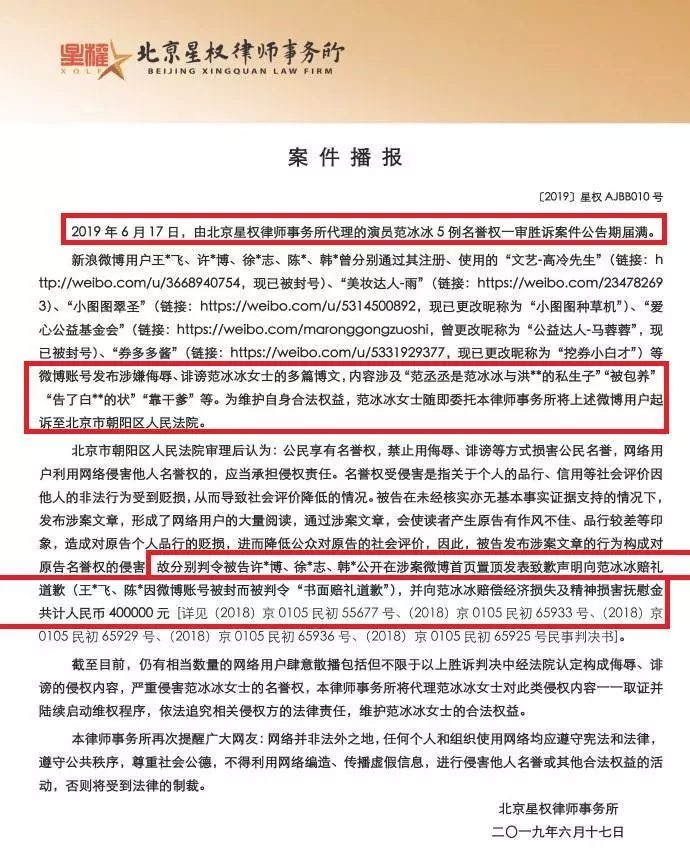 Mới đây, ngày 17 tháng 06, công ty luật sư Tinh quyền Bắc Kinh dưới sự ủy quyền của nữ diễn viên đã ra thông báo về quyết định của tòa với lá đơn kiện mới nhất của cô. Phạm Băng Băng đã khởi tố 5 người khi họ đã dùng những tài khoản trên Weibo đăng tải bài viết xúc phạm, phỉ báng, vu khống, cố tình hạ thấp hình ảnh Phạm Băng Băng, làm ảnh hưởng đến danh dự của nữ diễn viên.