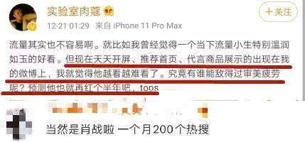 Với những câu nói này có thể ám chỉ nửa vòng giới giải trí. Thế nhưng, dựa vào những từ ngữ chủ đạo như tiểu sinh lưu lượng, ôn nhuận như ngọc, còn có ngày ngày xuất hiện trên weibo với tần suất cao, nhiều ý kiến đều đưa ra dự đoán dưới khu bình luận nam minh tinh đó có thể là Tiêu Chiến.